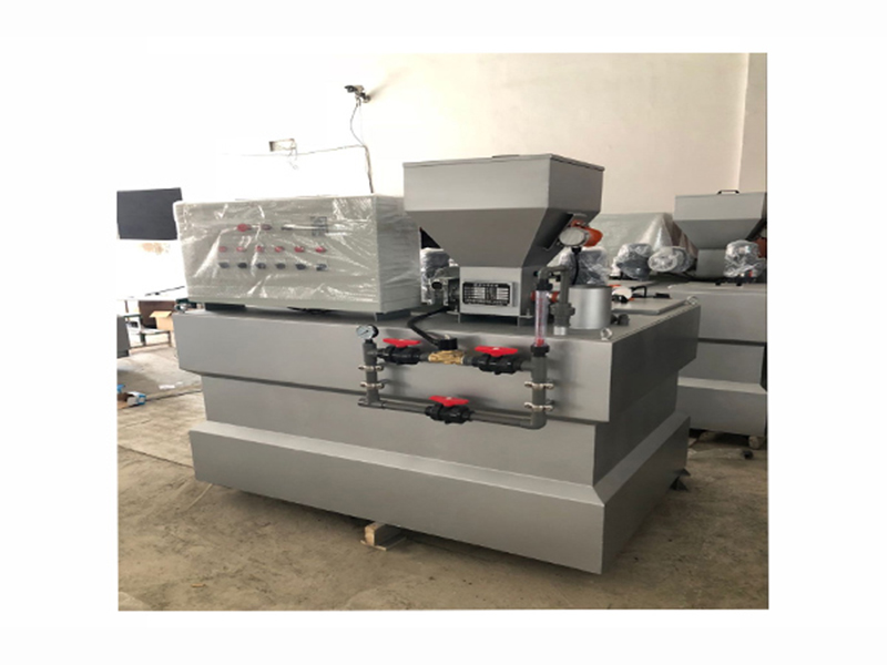 干粉絮凝劑從螺旋推進(jìn)器內(nèi)進(jìn)入速溶器內(nèi)與清水進(jìn)行預(yù)混,被濕潤(rùn)的物料進(jìn)入配制槽進(jìn)行攪拌稀釋,按要求濃度進(jìn)行配制;配制過程中,進(jìn)水量在流量計(jì)觀測(cè)下必須相對(duì)穩(wěn)定,從而保證在整個(gè)工作過程中,配制溶液濃度不變。
